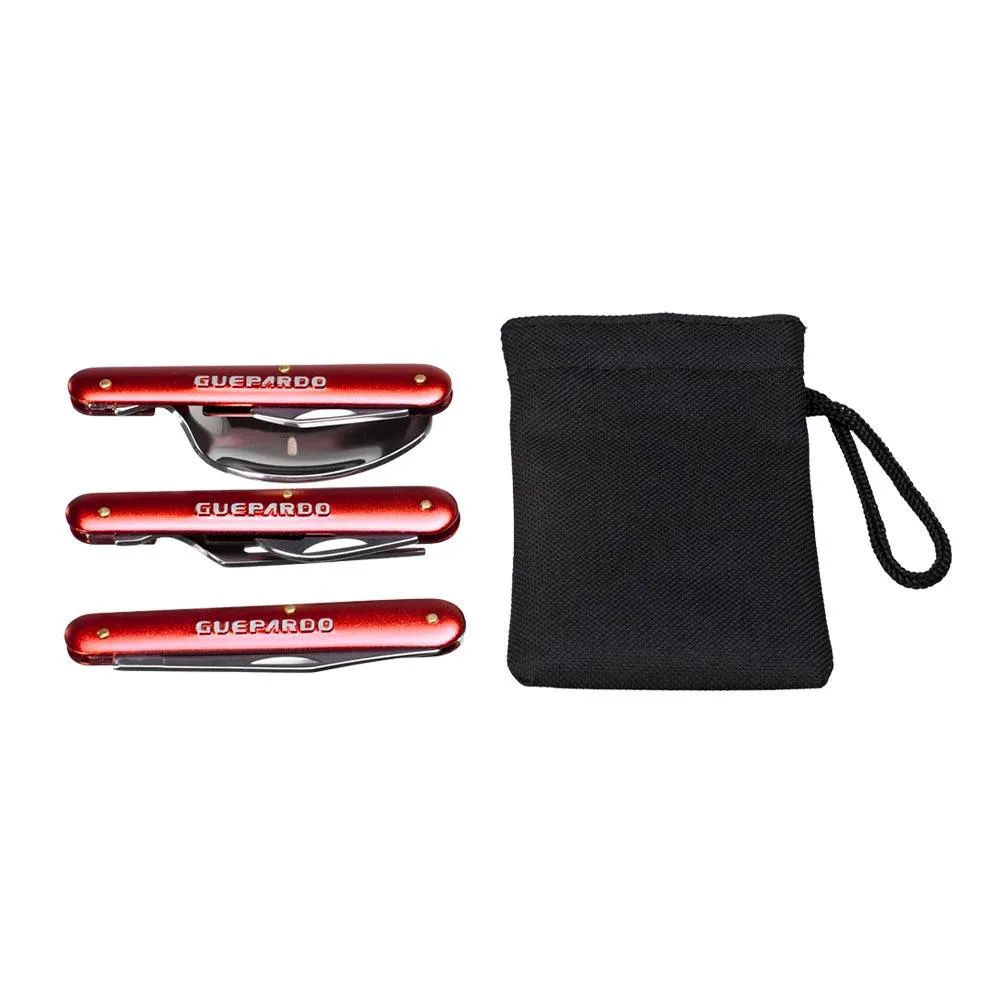 O Conjunto de Talheres Trekker da Guepardo vem com colher, garfo e faca. A colher possui a função de abridor de garrafas e o garfo de abridor de latas.